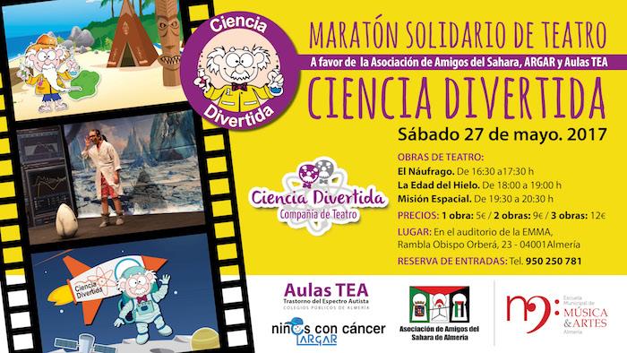 La conocida compañía CIENCIA DIVERTIDA, ha organizado una maratón solidaria de teatro. El beneficio de las entradas irá destinado a la Asociación de Amigos del Sahara, ARGAR (Asociación de padres de niños y adolescentes con cáncer) y Aulas Tea de colegios públicos de la provincia de Almería (Trastorno del Espectro Autista).