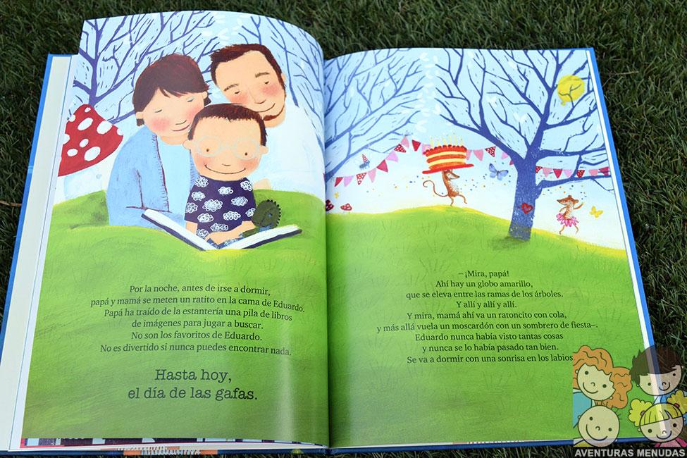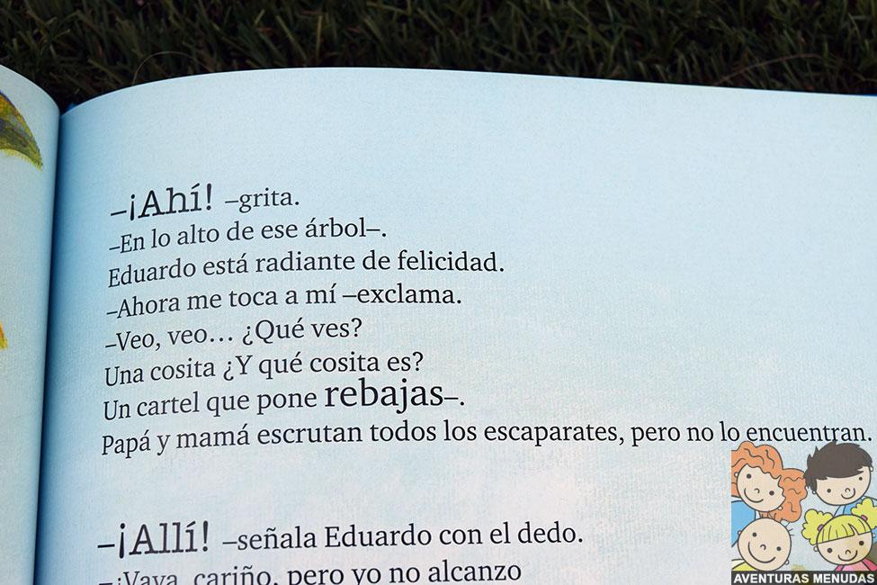 Al salir de la óptica, Eduardo y sus padres empiezan a jugar al Veo, veo… ¡cuantas cosas nuevas ve!. Y no solo eso. Puede ver cosas que sus padres no llegan a ver con claridad. Que bien se siente Eduardo al ver tantas cosas nuevas en el mundo. Por la noche, además, su padre le lleva libros de esos de buscar cosas en sus páginas, que nunca antes le habían gustado porque no encontraba nada. Cual es su sorpresa, que ahora lo ve todo y lo encuentra todo… ¡ahora si que le gustan estos cuentos!.
