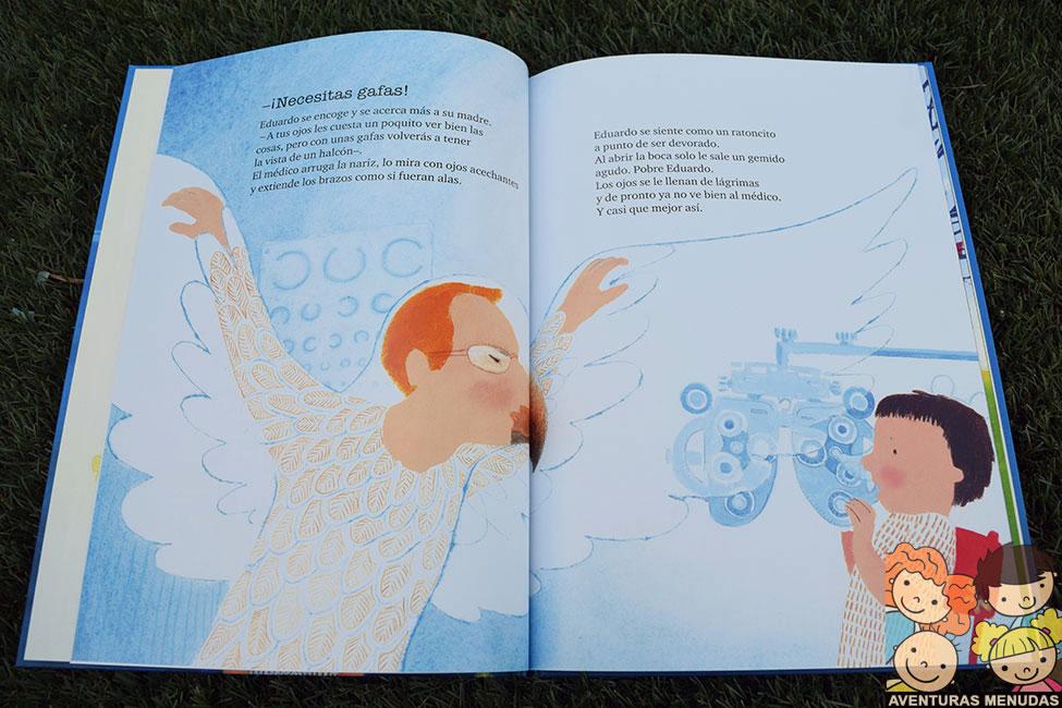Un día el médico le comunica a Eduardo que necesita llevar gafas. Él se siente asustado, nervioso. Ve al médico como un águila y a él como un ratoncillo al que van a apresar. ¿Pero un ratoncillo joven con gafas? ¿Dónde se ha visto eso?