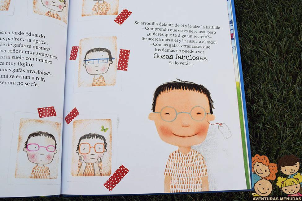 Menos mal que la señora de la óptica entiende lo que le pasa, así que le explica que con las gafas verá cosas que los demás no pueden ver, cosas fabulosas. Estas palabras le hacen sentir mucho mejor a Eduardo.