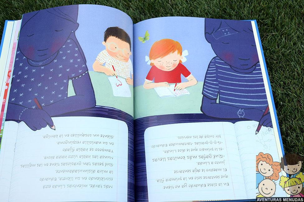 De camino al colegio al día siguiente, se siente increíblemente bien porque no solo ve cosas por donde pasa, que antes no veía, sino que además, como ya no tiene que sentarse en primera fila para ver bien, el maestro le sienta al lado de Linda. Ella, además, le dice que lleva unas gafas muy bonitas.