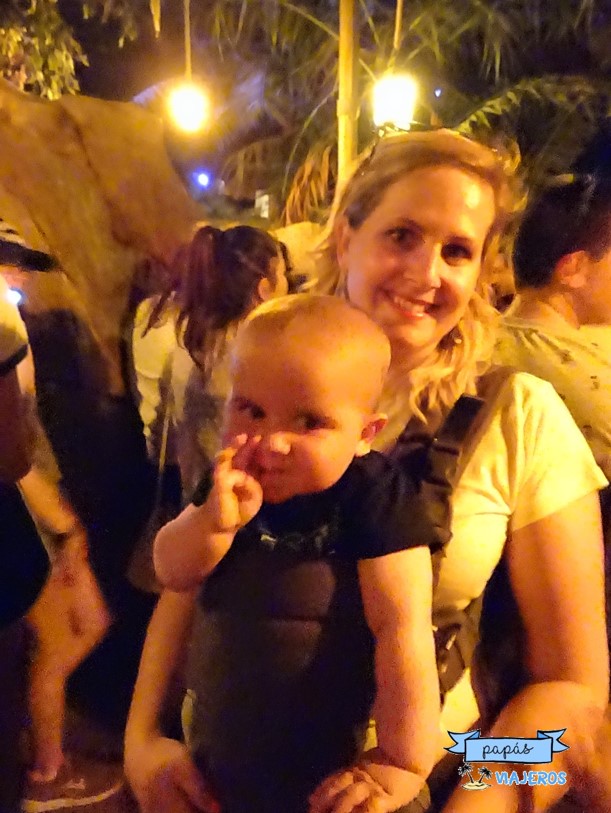 9.- Lleva una mochila para cargar al bebé. A nosotros nos iba genial dejar el carro fuera de la atracción y cargar al bebé viajero con una mochila para que no pese tanto. En la misma atracción te podías subir con el niño a cuestas.