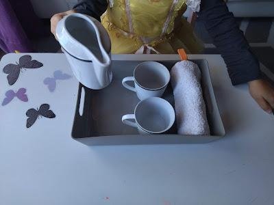Dispondremos en una bandeja de plástico las tazas y la jarra, así como un paño de cocina para limpiar el agua en caso de que se caiga.