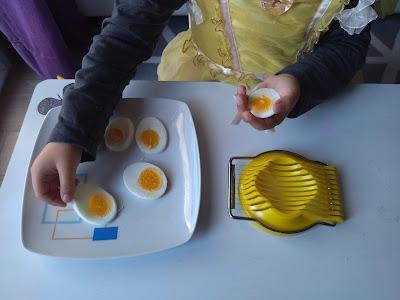 Otra tarea bastante sencilla y divertida para los niños consiste en cortar un huevo con un cortador de huevos cocidos. El niño puede trabajar su destreza manual pelándolo y después cortándolo en láminas y disponiéndolo en el plato.