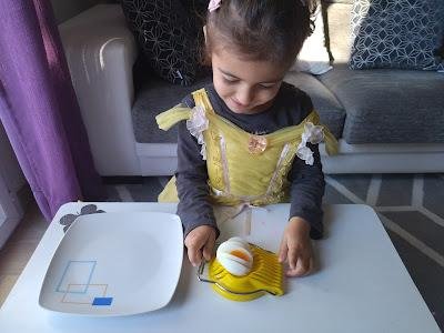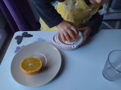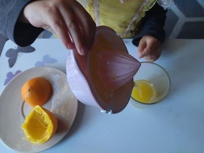 Ahora llega el turno de exprimir el zumo con el exprimidor manual. Es una actividad muy recomendable para reforzar las manos.