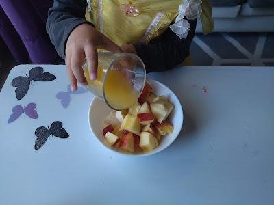 Ahora sólo queda verter el zumo en un vaso o echarlo directamente en nuestro bol con las fruta cortada. Así trabajamos también el trasvase de líquidos.