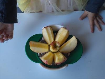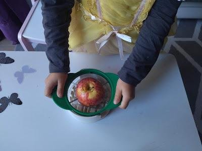 Ahora podemos cortar una manzana con un cortador especial para frutas que saca el corazón de la misma a la vez que la parte en gajos.