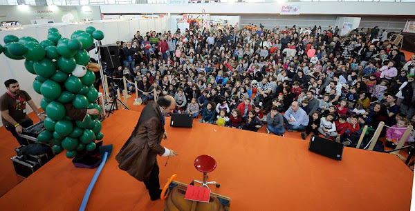 Según bajas por la rampa e entrada la niña se va emocionando, se ven un montón de stands con libros, pinturas, unos globos al fondo, carteles con colores vistosos que cuelgan por todos lados.