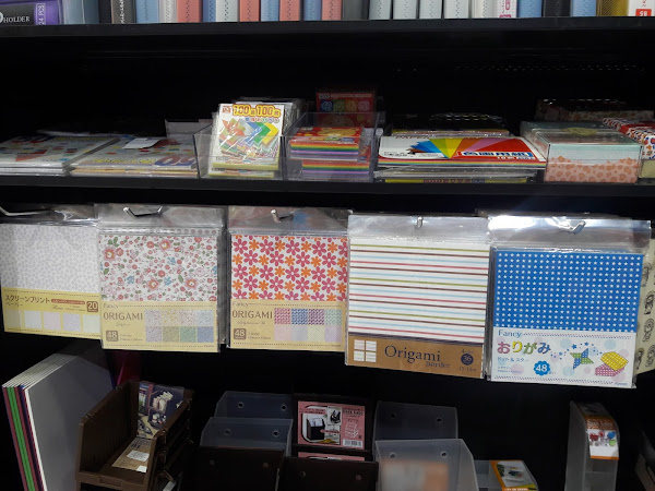 También hay una sección de útiles de oficina con cortadores de distintas formas, folders, blocks, etc. Pero lo que más me llamó la atención son los papeles con diseño hermosos que pueden servir para hacer origami o manualidades para cumpleaños de nuestros pequeños.