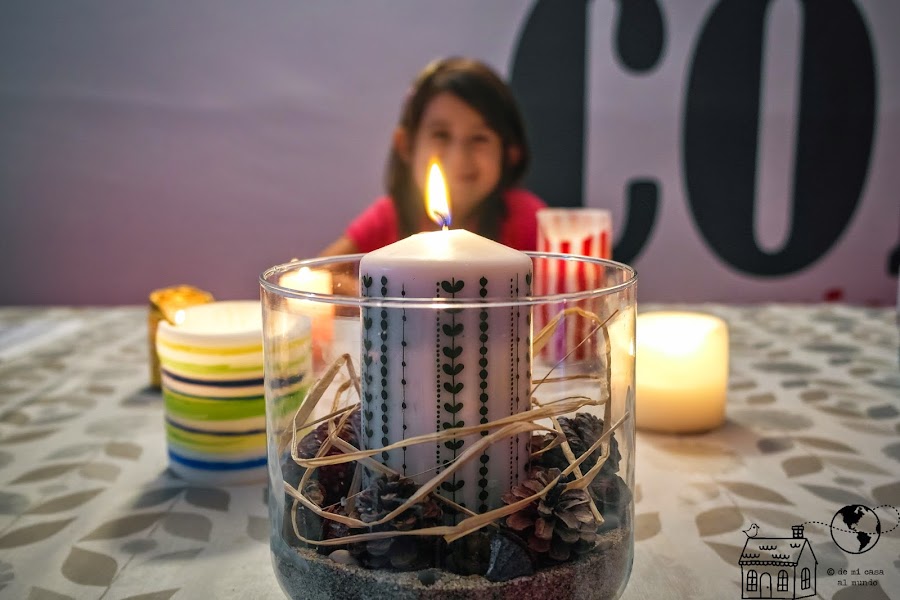 Para ello, en casa tenemos un pequeño centro que vamos decorando según la estación y la vela está encendida en todas las comidas que compartimos en familia.
