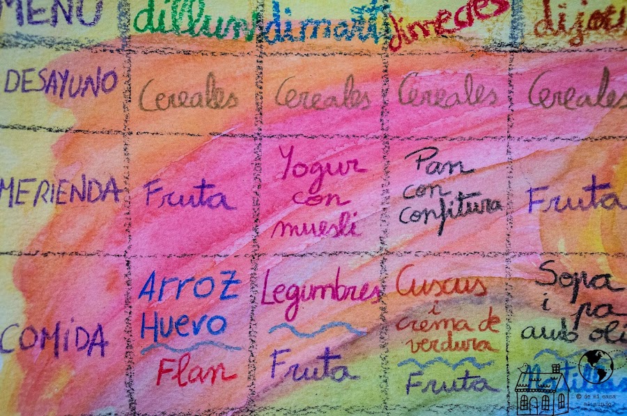 Por ejemplo, en casa, además de las rutinas para levantarse, o ir a dormir, donde hacemos cosas a modo de ritual, como cantar la canción de buenos días mientras nos vestimos, también tenemos un menú específico para cada día de la semana (igual que en su escuela) lo que ayuda a estructurar y dar orden a nuestro día a día respecto a las comidas. Y la verdad con lo que me costaba organizar este tema (no soy nada cocinillas), de esta manera es mucho más fácil.