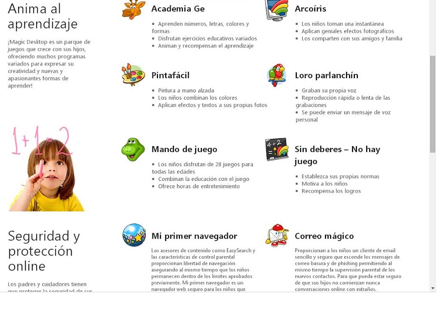 • Seguridad y protección online. Mi Primer Navegador es un navegador web seguro para los niños que proporciona a los padres la opción de buscar y aprobar páginas apropiadas. Correo Mágico es un cliente de email sencillo y seguro que esconde los mensajes de correo basura y de phishing permitiendo al mismo tiempo la supervisión parental de los nuevos contactos.