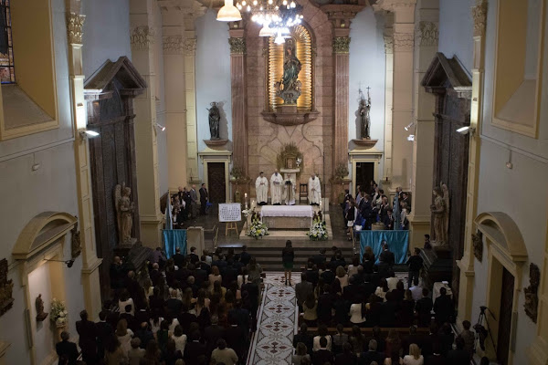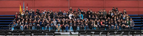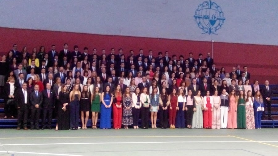 Tras el acto religioso, cambio de ubicación, todos los alumnos, profes, personal del cole, así como representantes de los Antiguos Alumnos pasan a hacerse las fotos protocolarias, por clase colocándose según la foto del catálogo de este año, todo el curso completo, con los tutores, con los profes de Bachiller, con todos los profes del cole, con unos con otros.... más de media hora de fotos...