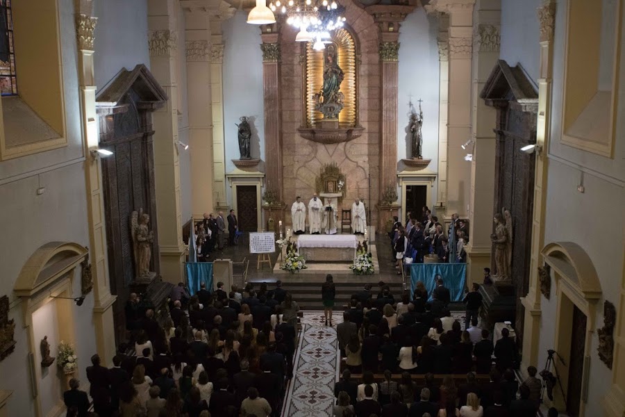 Una vez finalizado el acto académico comienza el acto religioso para lo que nos trasladamos a la Iglesia del cole, una lástima que el tiempo no permitiese que se celebrase en el patio de la Virgen, pues es mucho más bonito, pero... esto es Asturias...Antes hubo tiempo para alguna que otra foto. La ceremonia religiosa, como siempre, muy emotiva. Entrega de los claveles a la Virgen. Peque leyó, menos mal que le tocó pronto, porque si así y todo estaba nerviosa si le llega tocar leer al final, morimos todos de ansiedad jejeje.