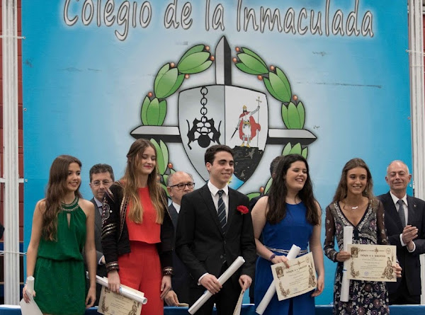 Tras la Pre-despedida y los ensayos de los distintos actos que iban a tener lugar por la tarde, corriendo a la pelu, "tengo que estar monísima, que es el día más importante", con el tiempo justo justo llegamos a casa para comer algo rápido y empezar con los preparativos porque había que estar en el cole a las 4.45, Entre los nervios propios del día y el andar a carreras fue de un estrés total, para todos. Pero allí estábamos en hora, más o menos, tampoco es cuestión de tirarnos flores que no nos tocan, que llegamos sí, a la hora..... bueno pues eso más o menos, pero vamos no la tuvieron que llamar ehhh... Como llovía y la niña tenía que entrar por la centralita, se bajó su hermana con ella para taparla con el paraguas y que no se mojase mientras nosotros metíamos el coche en el patio. Fuimos a coger sitio y a esperar que diera comienzo. Suena el himno del cole y todo el mundo de pie para recibir a los Bachilleres de la promoción 2016. Comienzan los discursos y la entrega de premios. Tras ellos comienzan a nombrar a los Bachilleres que suben al estrado donde se les entrega el Diploma y la orla.