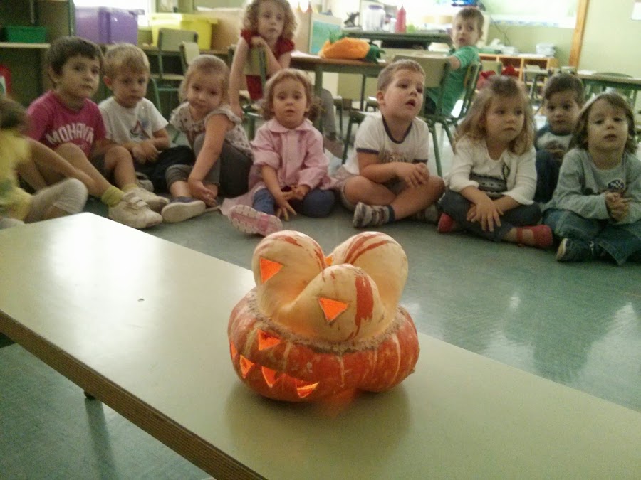 Hace unos días celebramos la festividad de todos los santos y con la seño Juana Mari trabajamos Halloween en el cole. La seño Mari Carmen nos prestó una calabaza con una vela y la encendimos viendo como se iluminaba.