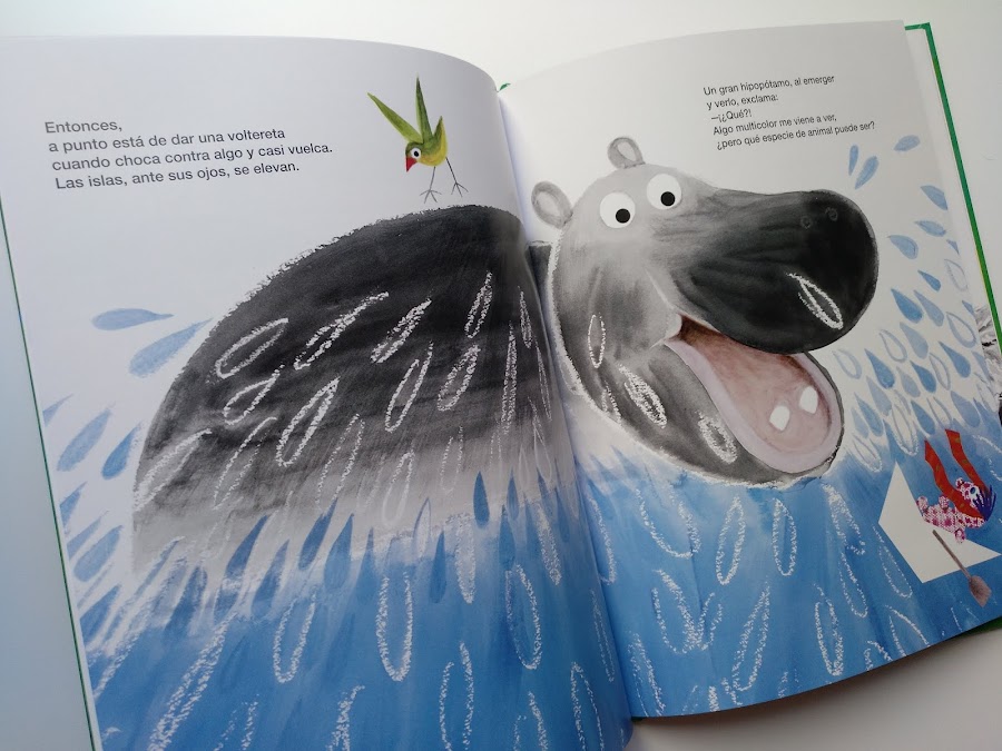 El pequeño –yo soy yo- empieza a agobiarse, no se siente bien y quiere desaparecer. Se aleja en una barca y se topa con unas aves que lejos de decirle quién es salen volando cuando un gran hipopótamo emerge al grito de: ¡Algo multicolor me viene a ver!