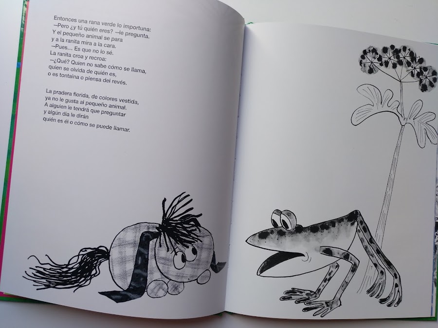 En una pradera de muchos colores un pequeño animal camina disfrutando de todo lo bonito que le ofrece la naturaleza pero de repente, una rana verde interrumpe su camino preguntándole ¿y tú quién eres?, el pequeño dice no saberlo...y sigue su camino.